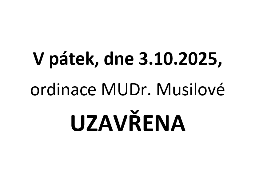 Praktický lékař pro dospělé MUDr. Musilová oznamuje uzavření ordinace z důvodu dovolené, a to v pátek, dne 3.10.2025. Děkujeme za pochopení.
