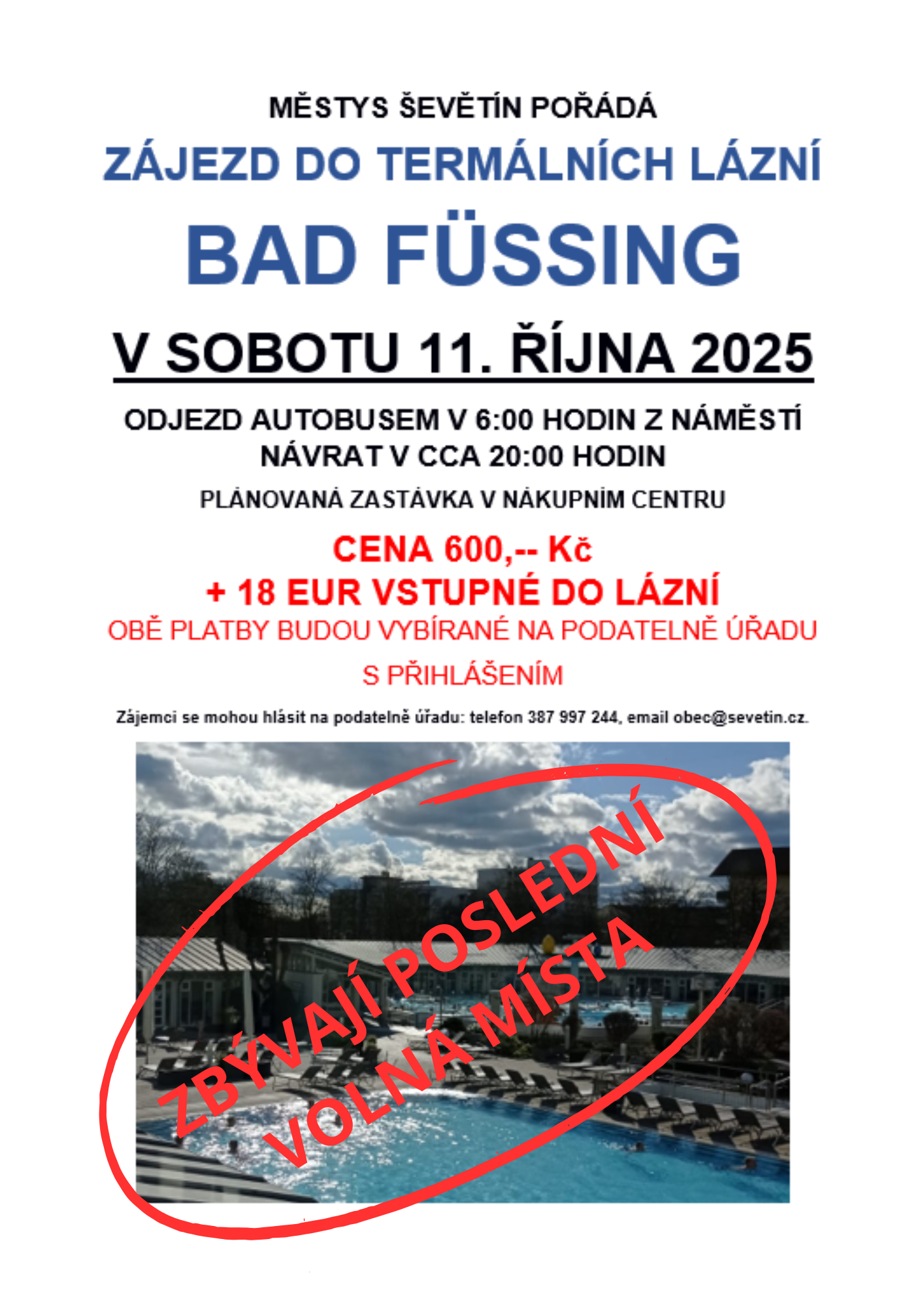 Městys Ševětín pořádá zájezd do lázní, odjezd autobusem v 6:00 hodin z náměstí, návrat v cca 20:00 hodin. Naplánovaná zastávka je v nákupním centru. Cena zájezdu 600,- + 18 eur vstupné do lázní. Obě platby budou nově vybírané na podatelně úřadu při přihlášení.
