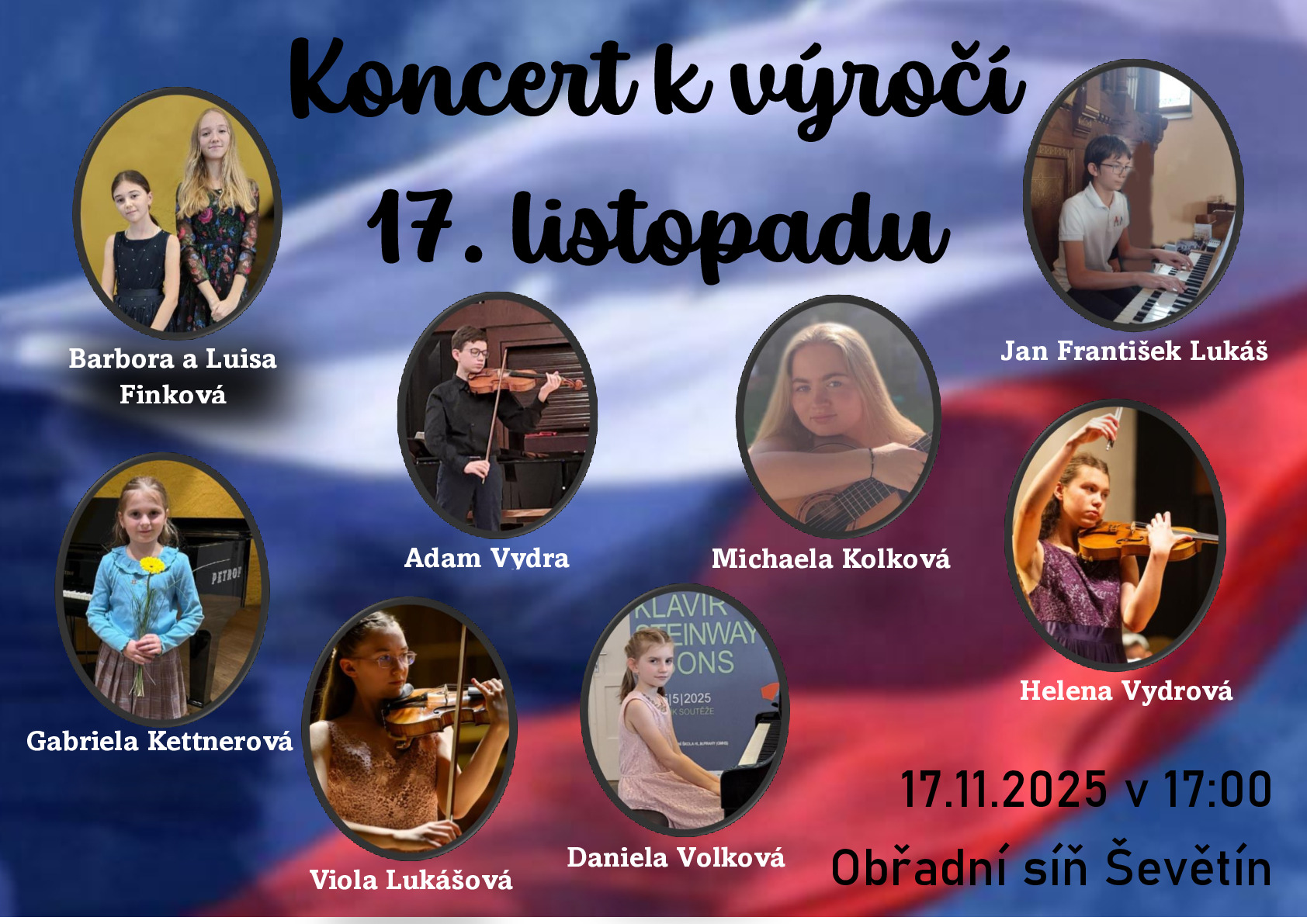 Srdečně Vás zveme společně s hudebními talenty v pondělí 17. listopadu 2025 v 17:00 hodin do obřadní síně městyse Ševětín na koncert k výročí 17. listopadu. Oslavme společně Den boje za svobodu a demokracii hudbou, která Vás dojme a okouzlí.