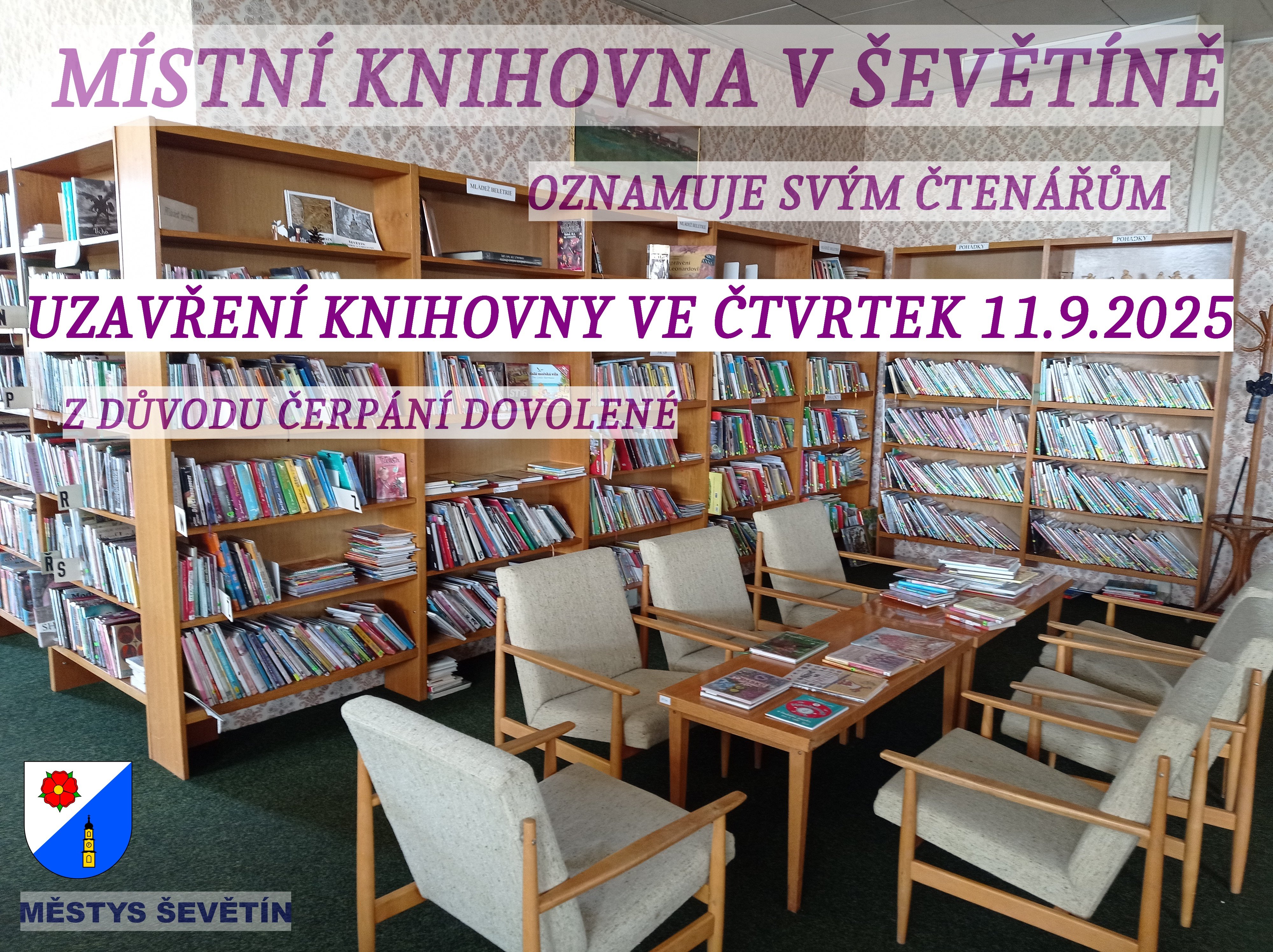 Místní knihovna v Ševětíně oznamuje svým čtenářům, že ve čtvrtek 11. září 2025, bude knihovna zavřena z důvodu čerpání dovolené. Děkujeme za pochopení.