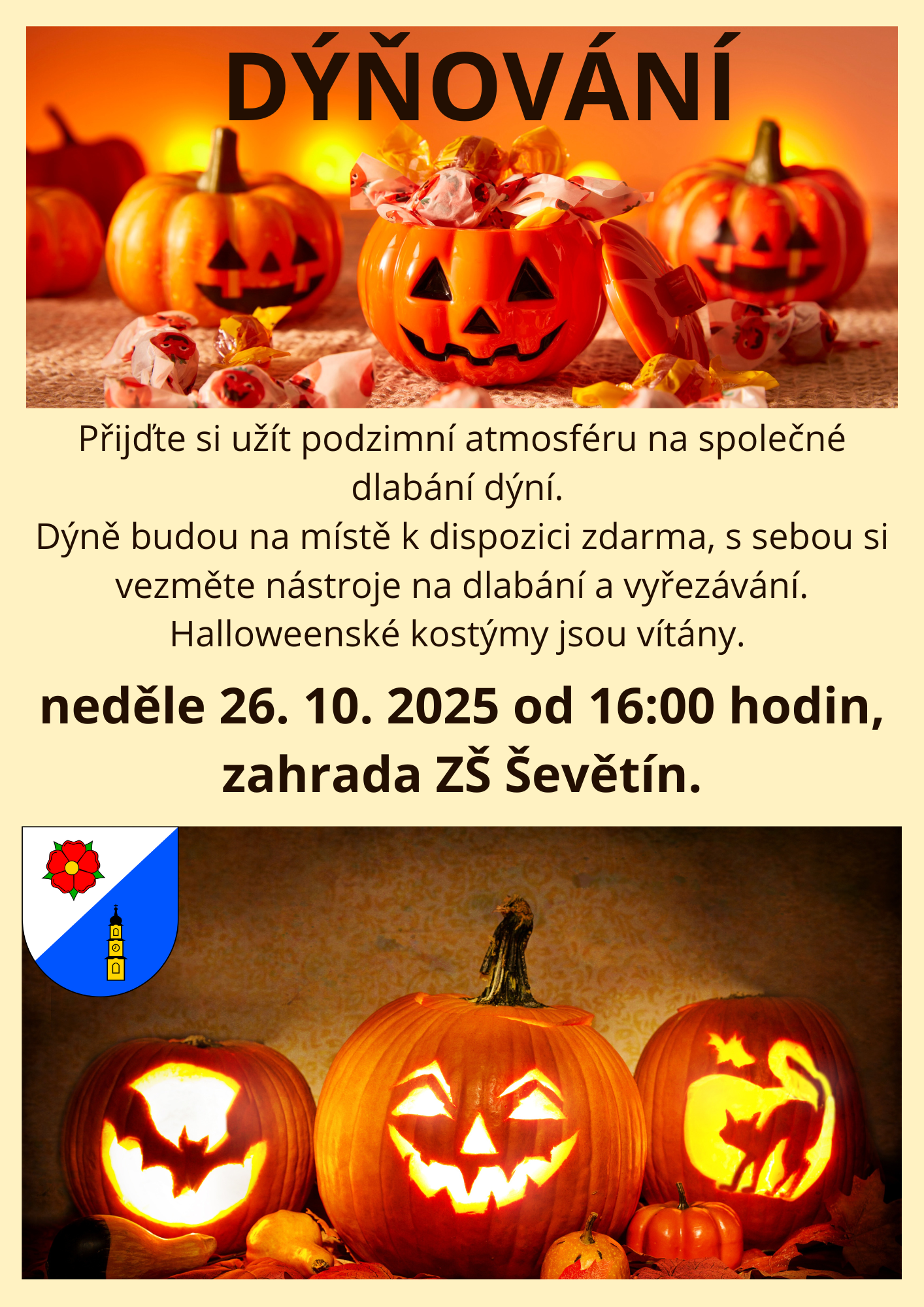 Přijďte si užít podzimní atmosféru na společné dlabání dýní v neděli 26. 10. 2025 od 16:00 hodin, zahrada ZŠ Ševětín. Dýně budou na místě k dispozici zdarma, s sebou si vezměte nástroje na dlabání a vyřezávání. Halloweenské kostýmy jsou vítány.