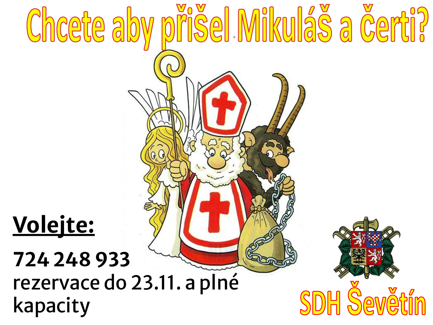 Milí rodičové, chcete-li, aby k Vám na návštěvu, 5. prosince, dorazil Mikuláš a čerti, ozvěte se na tel. číslo: 724 248 933, nejdéle do 23.11. SDH Ševětín.