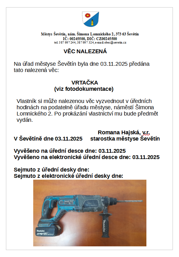 Na úřad městyse Ševětín byla dne 03. 11. 2025 předaná věc nalezená - vrtačka. Vlastník si může nalezenou věc, po prokázání vlastnictví, vyzvednout v úředních hodinách na podatelně úřadu městyse.