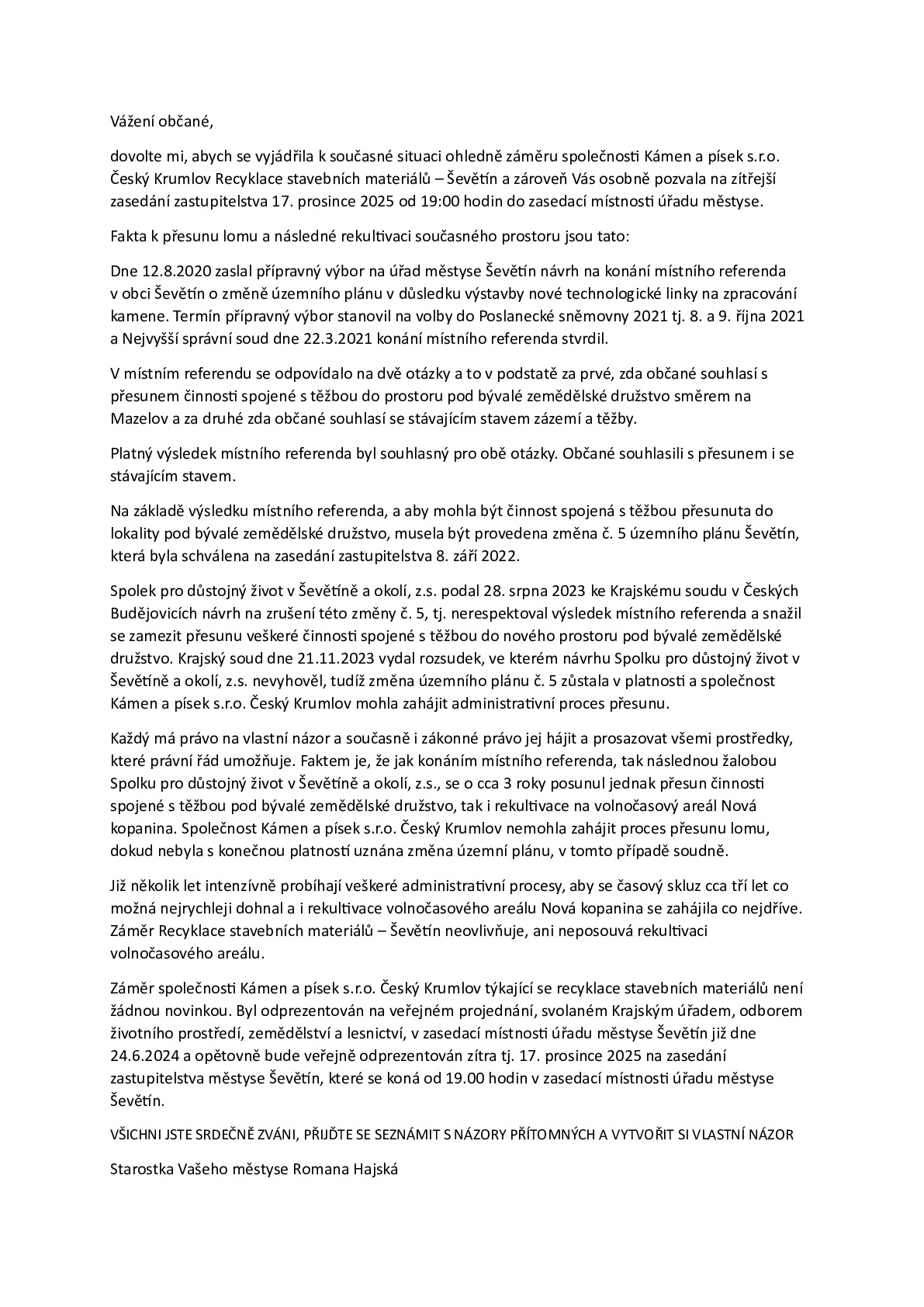 zasílám vyjádření k záměru společnosti Kámen a písek s.r.o. Český Krumlov s pozváním na zítřejší zasedání zastupitelstva.