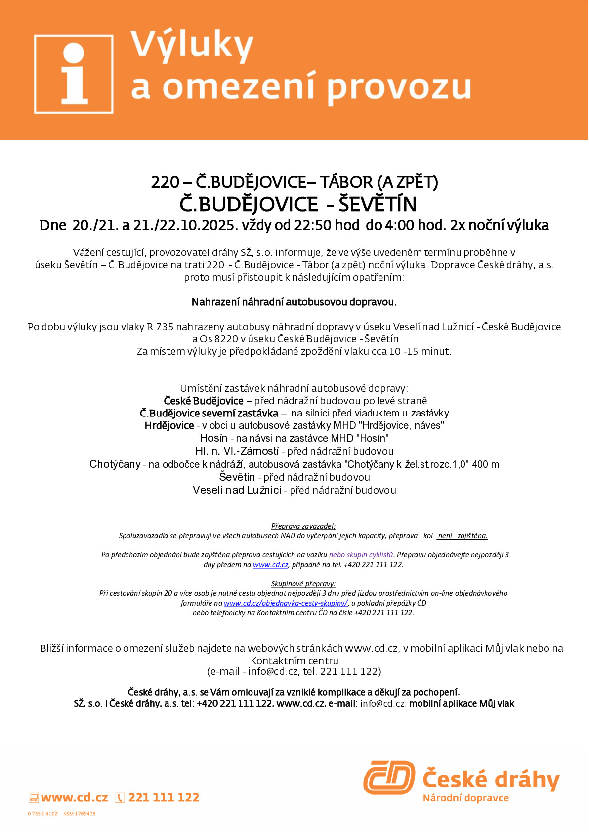České dráhy oznamují výlukový jízdní řád na trase 220 - Č. Budějovice - Tábor (a zpět), Č. Budějovice - Ševětín, dne 20./21. a 21./22.10.2025 vždy od 22:50 hod do 4:00 hod., 2x noční výluka.