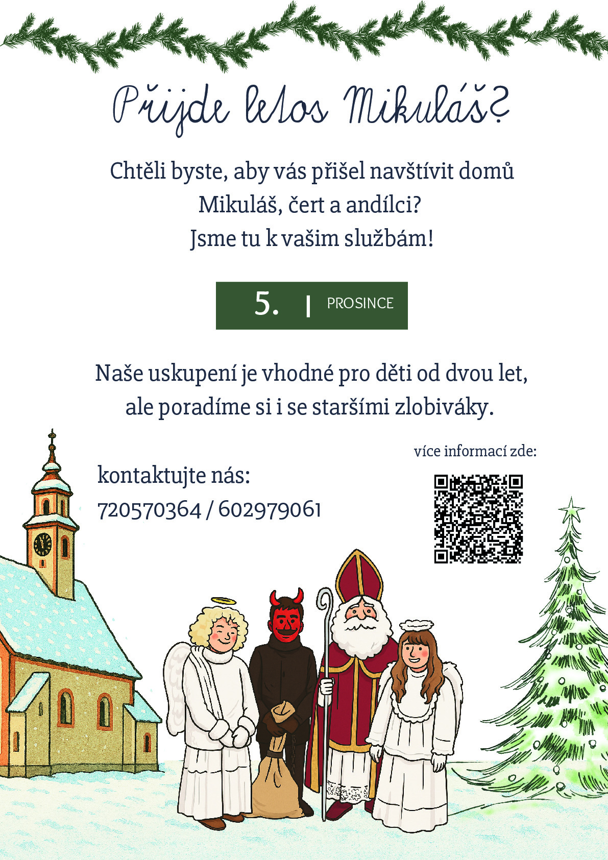 Nabídka návštěvy Mikuláše, čerta a andílků u Vás doma. Více informací na tel. číslech: 720570364/602989061 nebo na přiloženém letáčku na QR kódu.