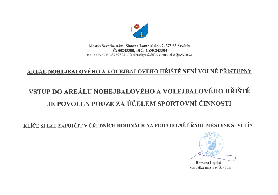 Vstup do areálu nohejbalového a volejbalového hřiště je povolen pouze za účelem sportovní činnosti. Klíče si lze zapůjčit v úředních hodinách na podatelně úřadu městyse Ševětín.