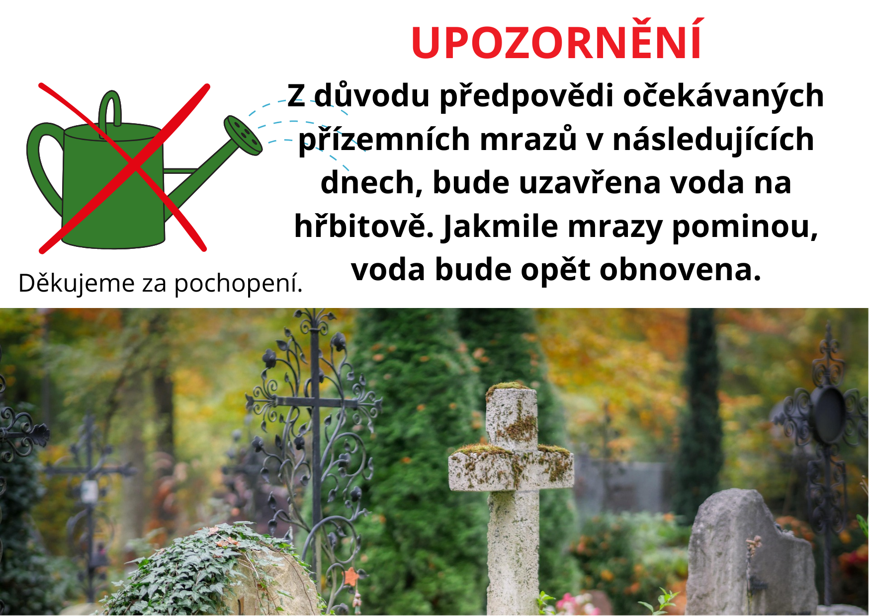 Upozornění - Z důvodu předpovědi očekávaných přízemních mrazů v následujících dnech, bude uzavřena voda na hřbitově. Jakmile mrazy pominou, voda bude opět obnovena.