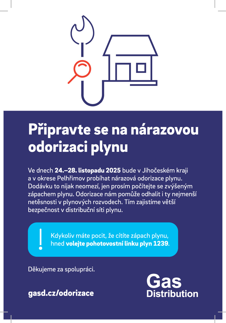 Ve dnech 24.-28. listopadu 2025 bude v Jihočeském kraji a v okrese Pelhřimov probíhat nárazová odorizace plynu. Dodávku plynu to nijak neomezí, jen prosím počítejte s případným zvýšeným zápachem plynu. Odorizace nám pomůže odhalit i ty nejmenší netěsnosti v plynových rozvodech a zajistit větší bezpečnost v distribuční síti plynu.