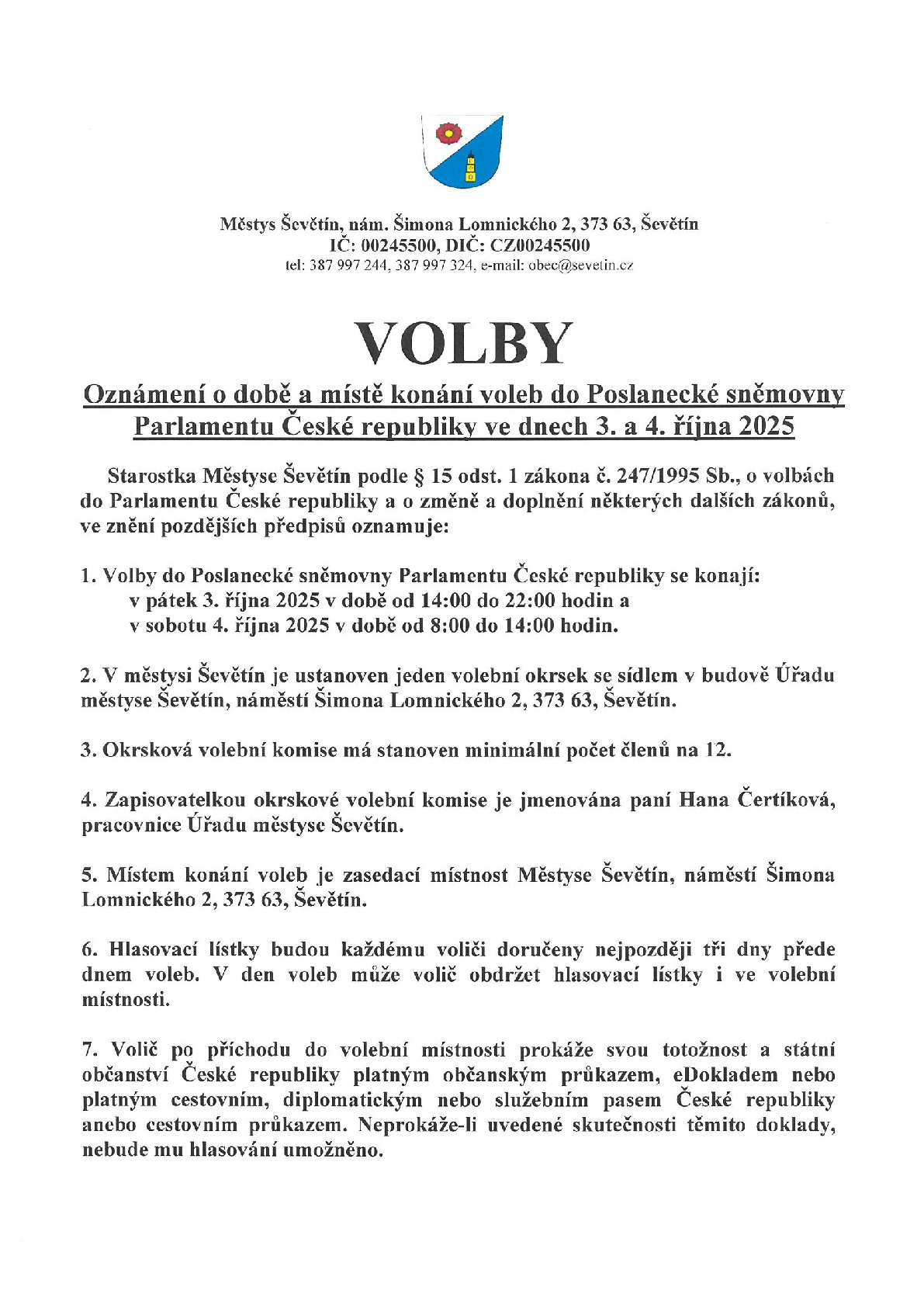 Městys Ševětín oznamuje konání voleb do Poslanecké sněmovny Parlamentu České republiky konané ve dnech 03. a 04. října 2025", viz příloha.