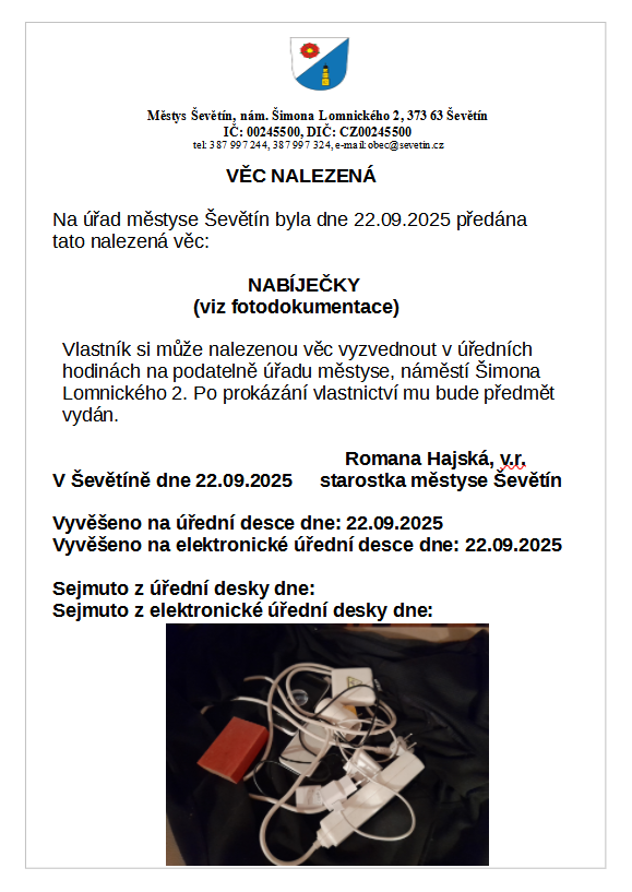 Na úřad městyse Ševětín byla dne 22. 9. 2025 předaná věc nalezená - nabíječky. Vlastník si může nalezenou věc, po prokázání vlastnictví, vyzvednout v úředních hodinách na podatelně úřadu městyse.