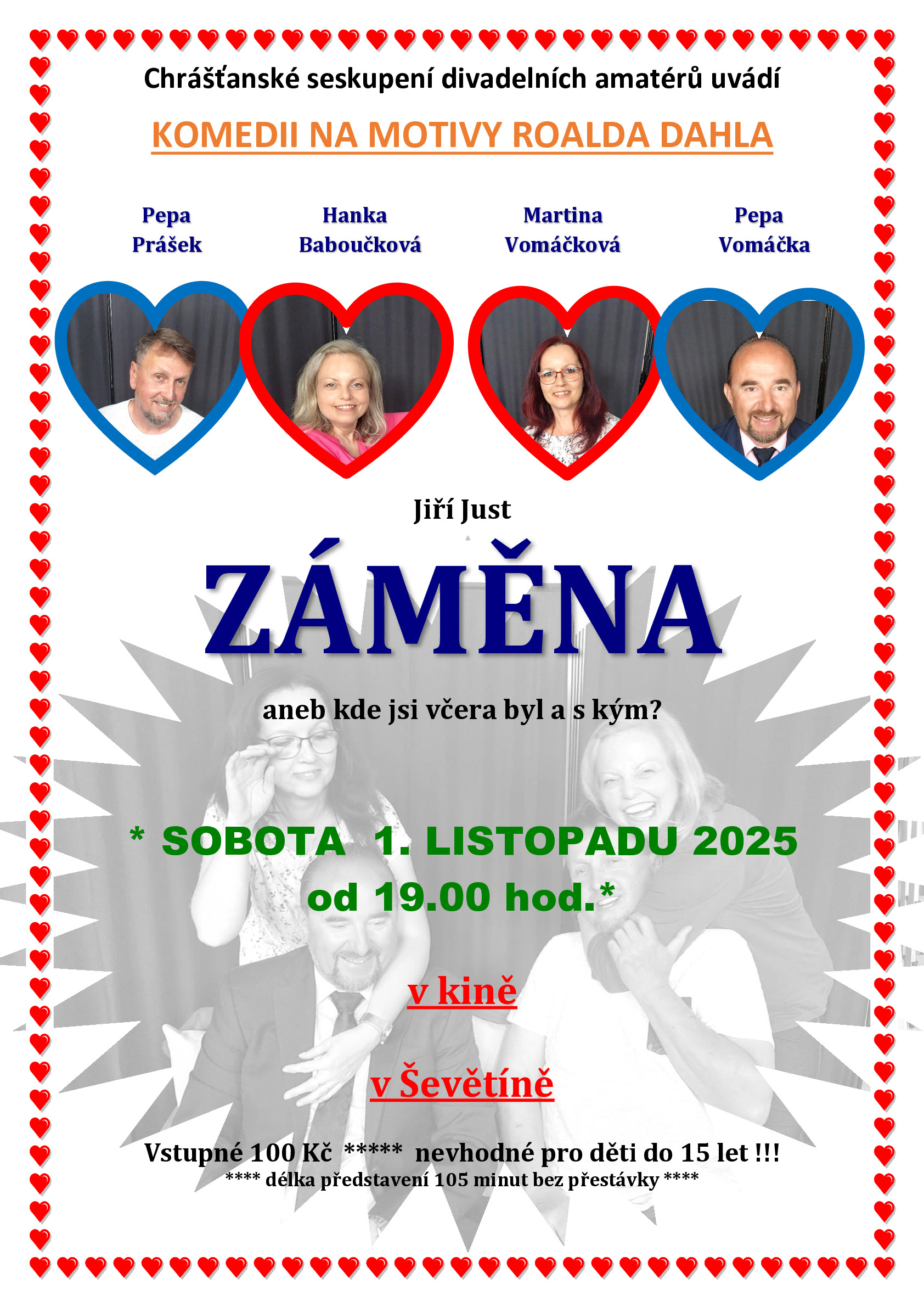 Chrášťanské seskupení divadelních amatérů uvádí kmedii "Záměna" aneb "kde jsi včera byl a s kým?" v sobotu 1. listopadu 2025 od 19:00 hodin v kině Ševětín. Vstupné 100,- Kč, délka představení 105 minut bez přestávky. Pozor, nevhodné pro děti do 15 let!!