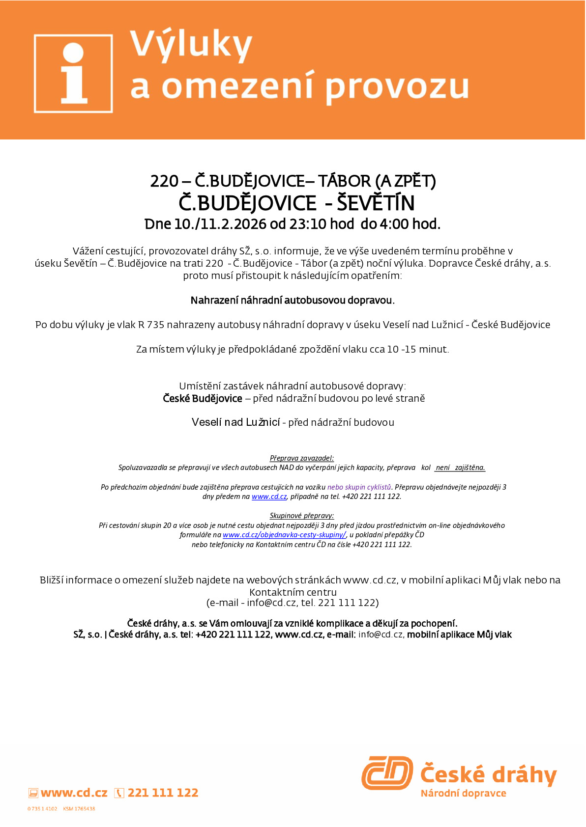 České dráhy oznamují výlukový jízdní řád v úseku Ševětín - Č. Budějovice, na trati 220 - Č. Budějovice - Tábor (a zpět) dne 9. a 10.02.2026 vždy od 9:30 hod do 17:30 hod. a dne 10./.11.02.2026 noční výluka od 23:10 hod do 4:00 hod.