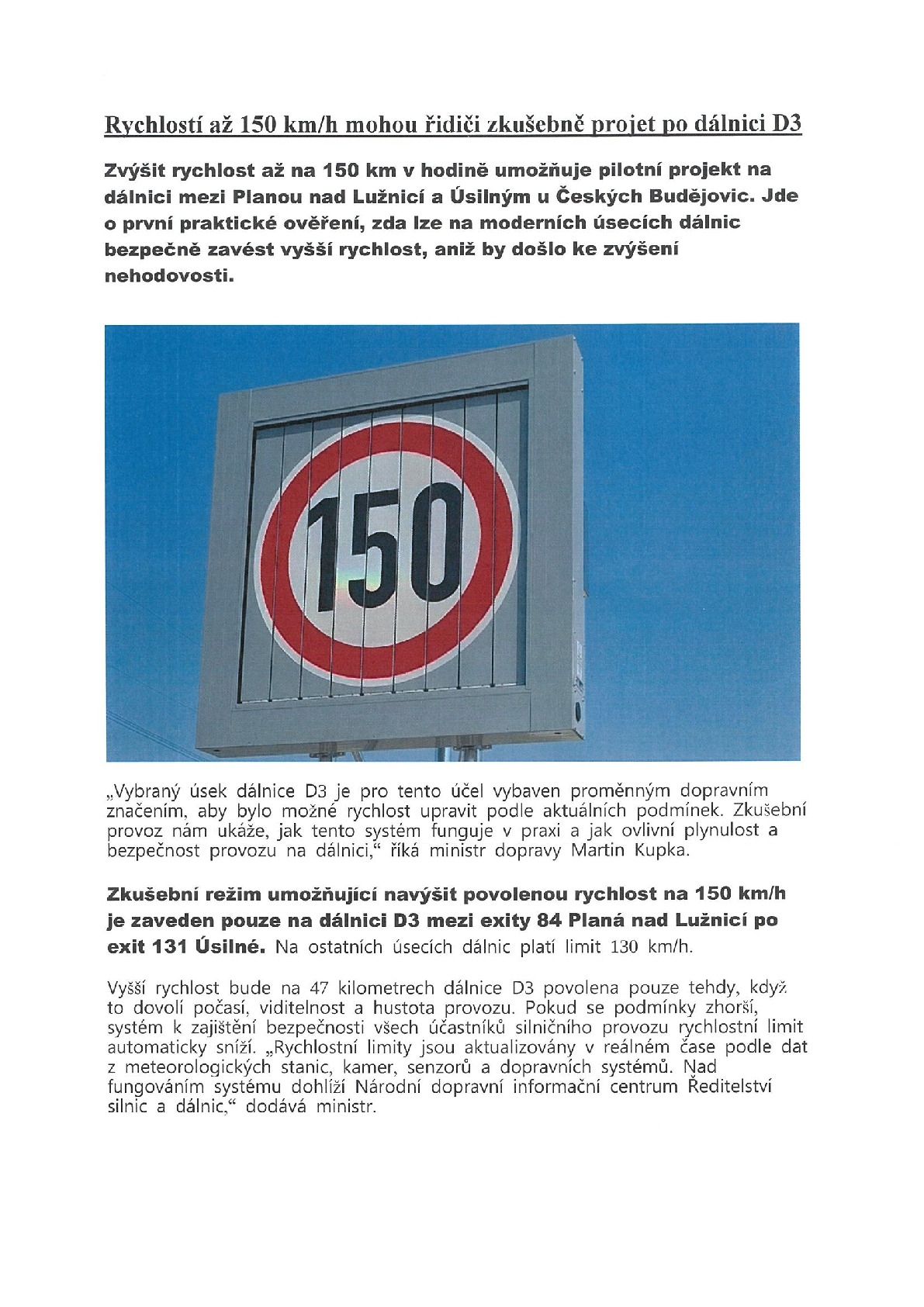Zvýšení rychlosti až na 150 km v hodině umožňuje zkušební režim na dálnici D3 mezi exity 84 Planá nad Lužicí po exit 131 Úsilné. Jde o první praktické ověření, zda lze na moderních úsecích dálnic bezpečně zavést vyšší rychlost, aniž by došlo ke zvýšení nehodovosti.