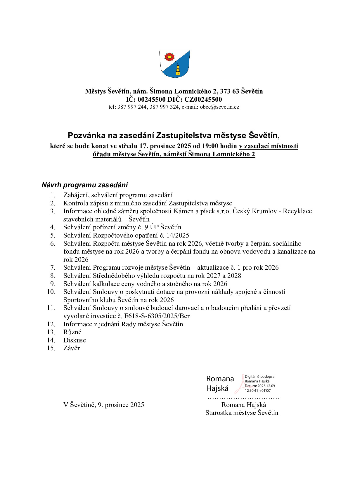 Zasedání Zastupitelstva městyse Ševětín se bude konat ve středu 17. prosince 2025 od 19:00 hodin v zasedací místnosti městyse Ševětín, náměstí Šimona Lomnického 2.
