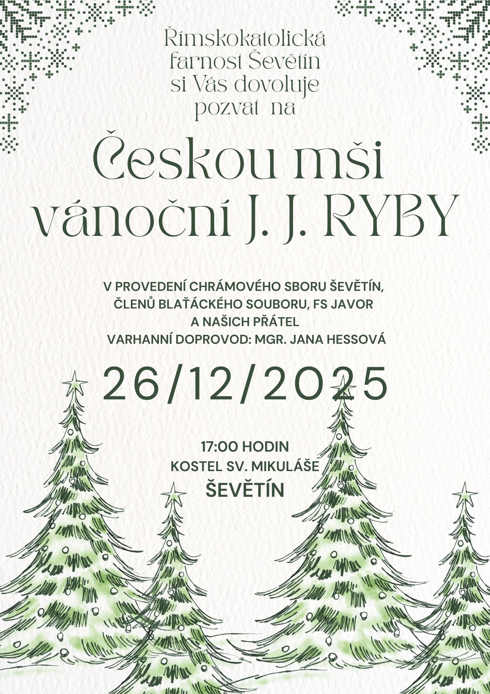 Římskokatolická farnost Ševětín Vás srdečně zve na druhý svátek vánoční 26. prosince v 17:00 hodin do kostela sv. Mikuláše v Ševětíně na Českou mši vánoční Jakuba Jana Ryby, v provedení Chrámového sboru Ševětín, členů Blaťáckého souboru Ševětín, Folklórního souboru Javor Lomnice nad Lužnicí a jejich přátel. Varhanní doprovod: Mgr. Jana Hessová.