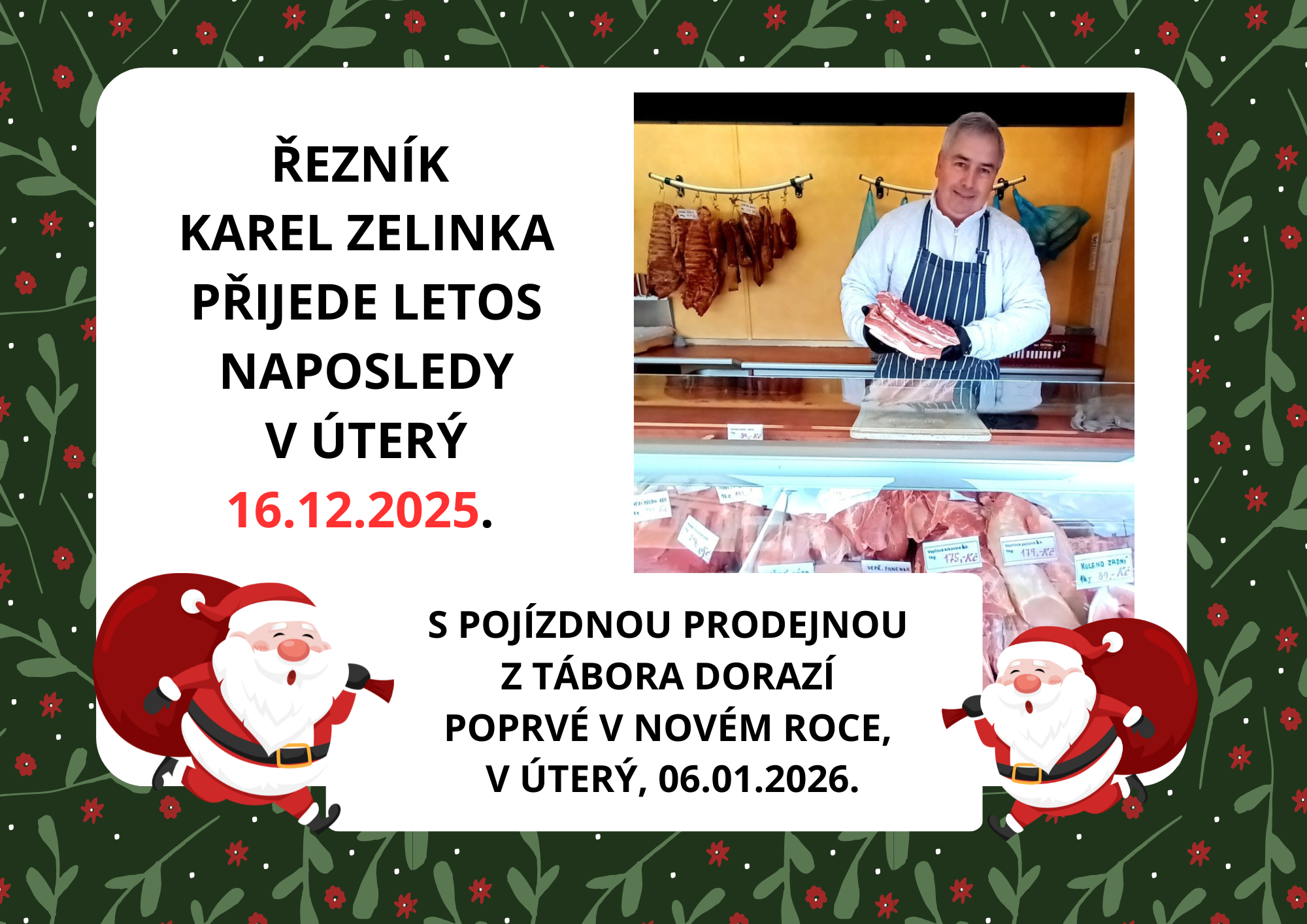 Řezník Karel Zelinka přijede, s pojízdnou prodejnou z Tábora, letos naposledy v úterý 16.12.2025. V Novém roce pak poprvé dorazí 6. ledna 2026.