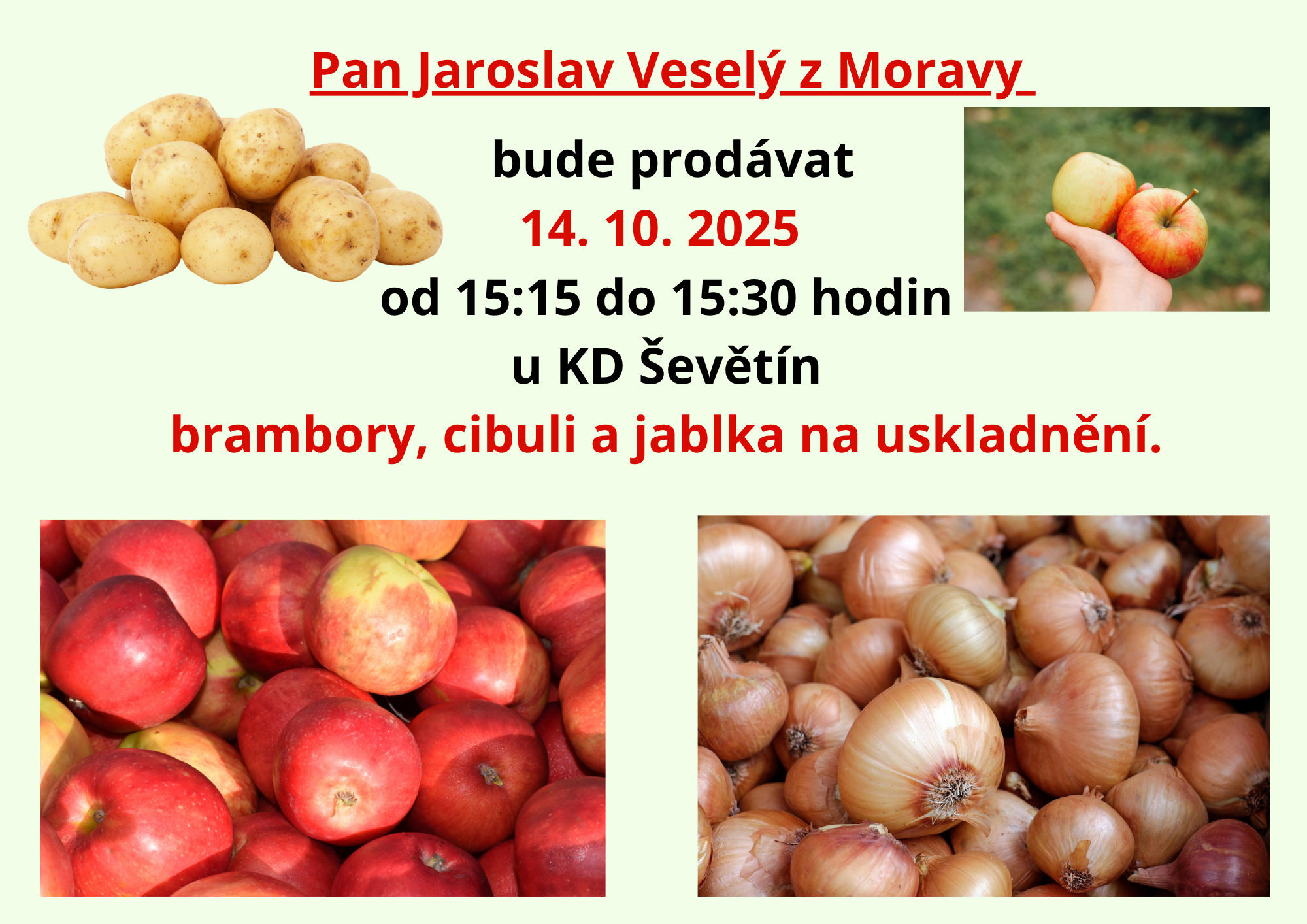 Pan Veselý z Moravy bude prodávat v úterý 14. 10. 2025 od 15:15 do 15:30 hodin u KD Ševětín brambory, cibuli a jablka na uskladnění.