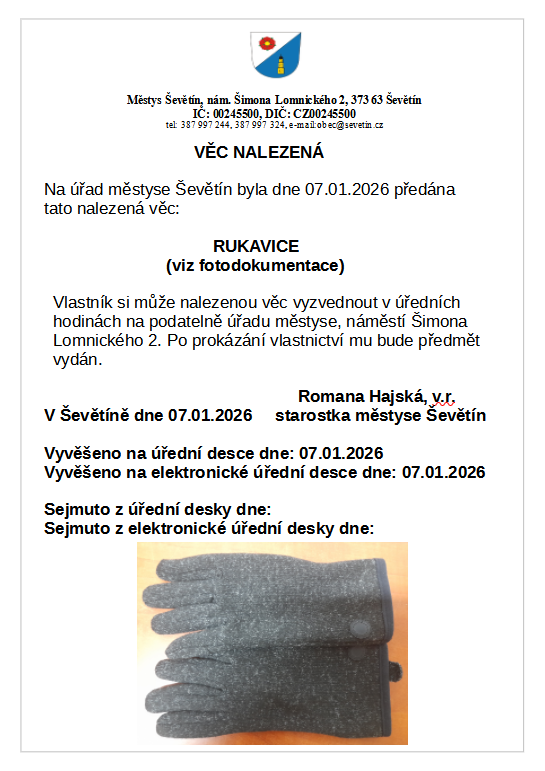 Na úřad městyse Ševětín byla dne 07. 01. 2026 předaná věc nalezená - rukavice. Vlastník si může nalezenou věc, po prokázání vlastnictví, vyzvednout v úředních hodinách na podatelně úřadu městyse.