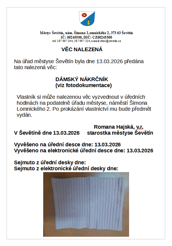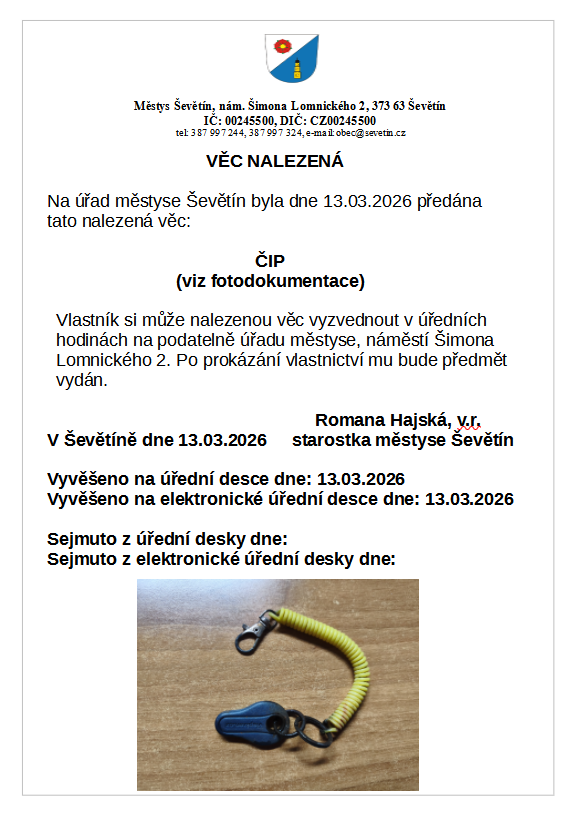 Městys Ševětín dále upozorňuje majitele psů na ohlašovací povinnost, (tj. přihlášení/odhlášení psa), vůči správci poplatku, kterým je Městys Ševětín, viz Úřední deska-Formuláře. Všichni majitelé psů si i letos mohou bezplatně vyzvednout ekologické sáčky na psí exkrementy v kanceláři městyse.