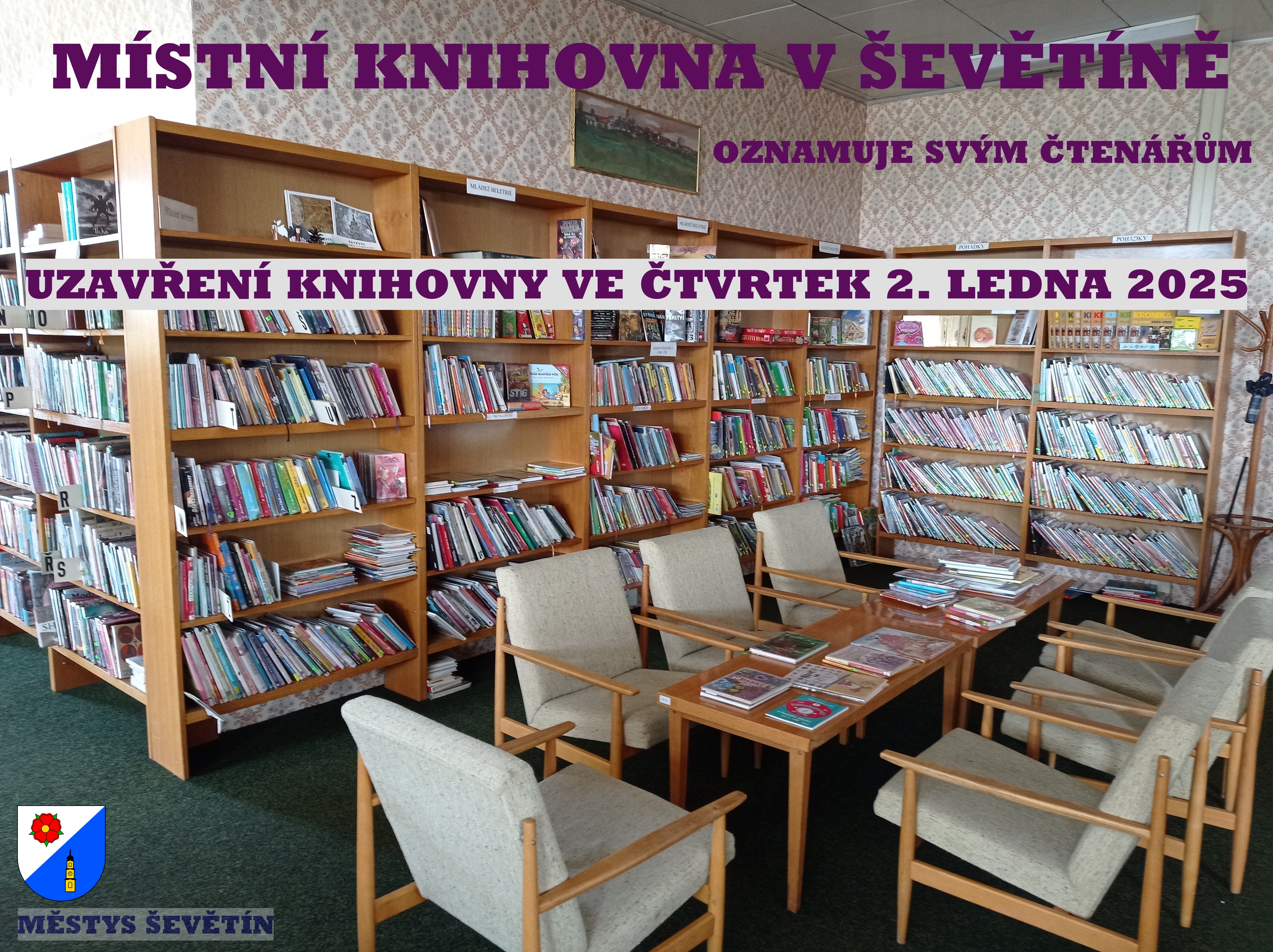 Místní knihovna v Ševětíně oznamuje svým čtenářům, že bude ve čtvrtek 2. ledna 2025 uzavřena.
