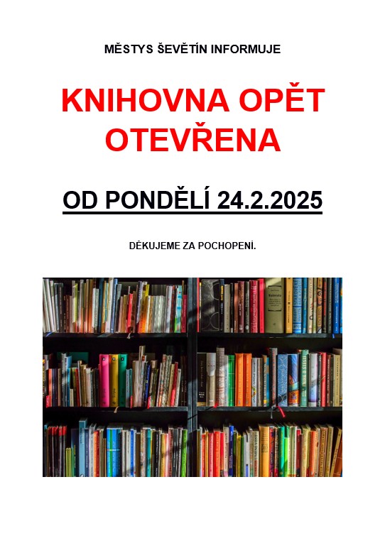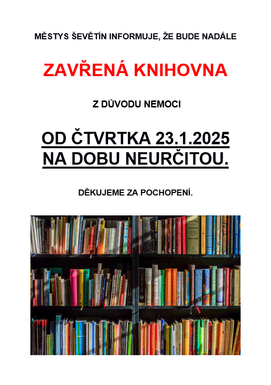 Městys Ševětín informuje, že knihovna bude od pondělí 9. února do čtvrtka 12. února 2026 zavřená. Děkujeme za pochopení.