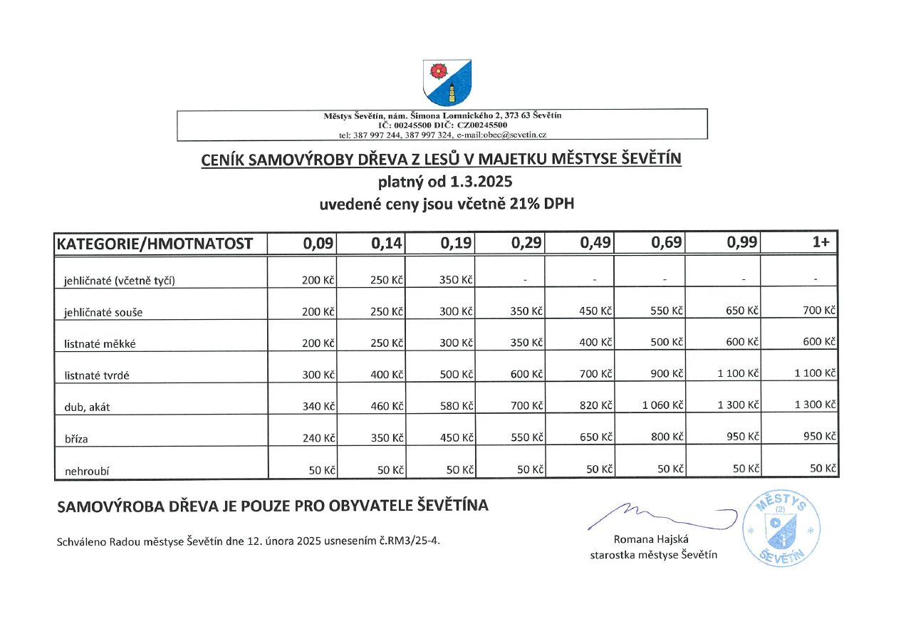Na úřední desce městyse Ševětín byla zveřejněna informace - Ceník prodeje dřeva z lesů v majetku městyse Ševětín, viz příloha.
