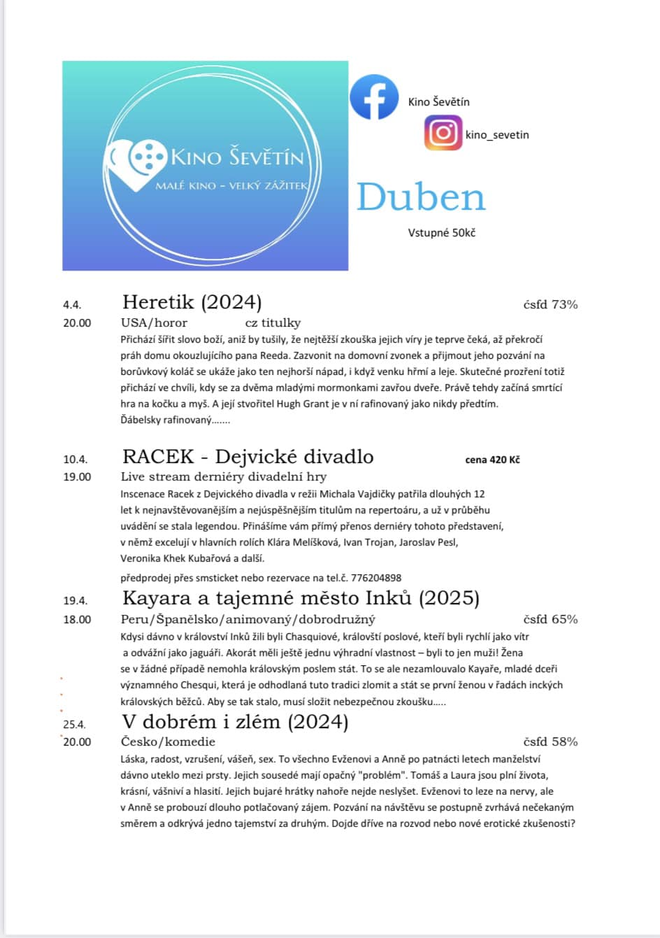 Srdečně Vás zveme na Masopustní průvod v sobotu 14. 2. 2026, kdy od 9:00 hodin začíná průvod na náměstí. Ve 20:00 hodin začíná v Kulturním domě Masopustní veselice. K tanci a poslechu hraje kapela Takton. Rezervace na večerní zábavu je možná na tel.: 724 113 797, pan Martin Švihel. Základní vstupné: 250,-Kč/snížené vstupné pro propracované masky: 150,-Kč.