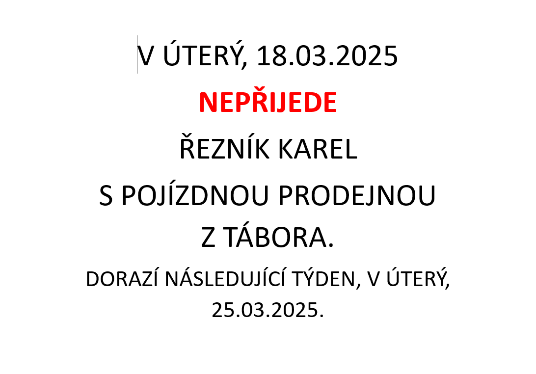 Řezník Karel s pojízdnou prodejnou z Tábora nepřijede 3. a 10. února 2026. Dorazí v úterý, 17.2.2026.