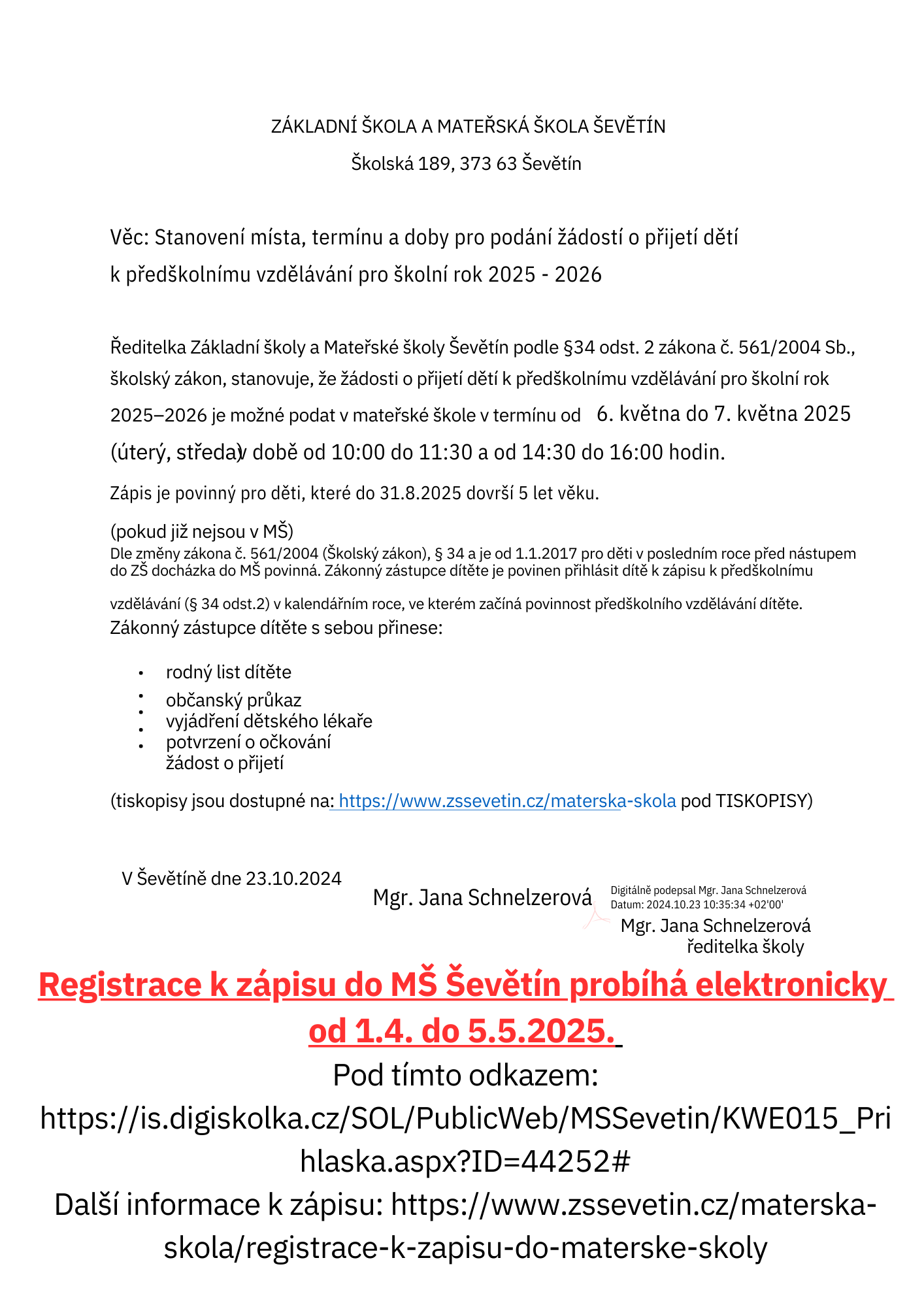 ZŠ a MŠ Ševětín zveřejňuje Kritéria pro příjímání dětí do MŠ pro školní rok 2025/2026, viz příloha.