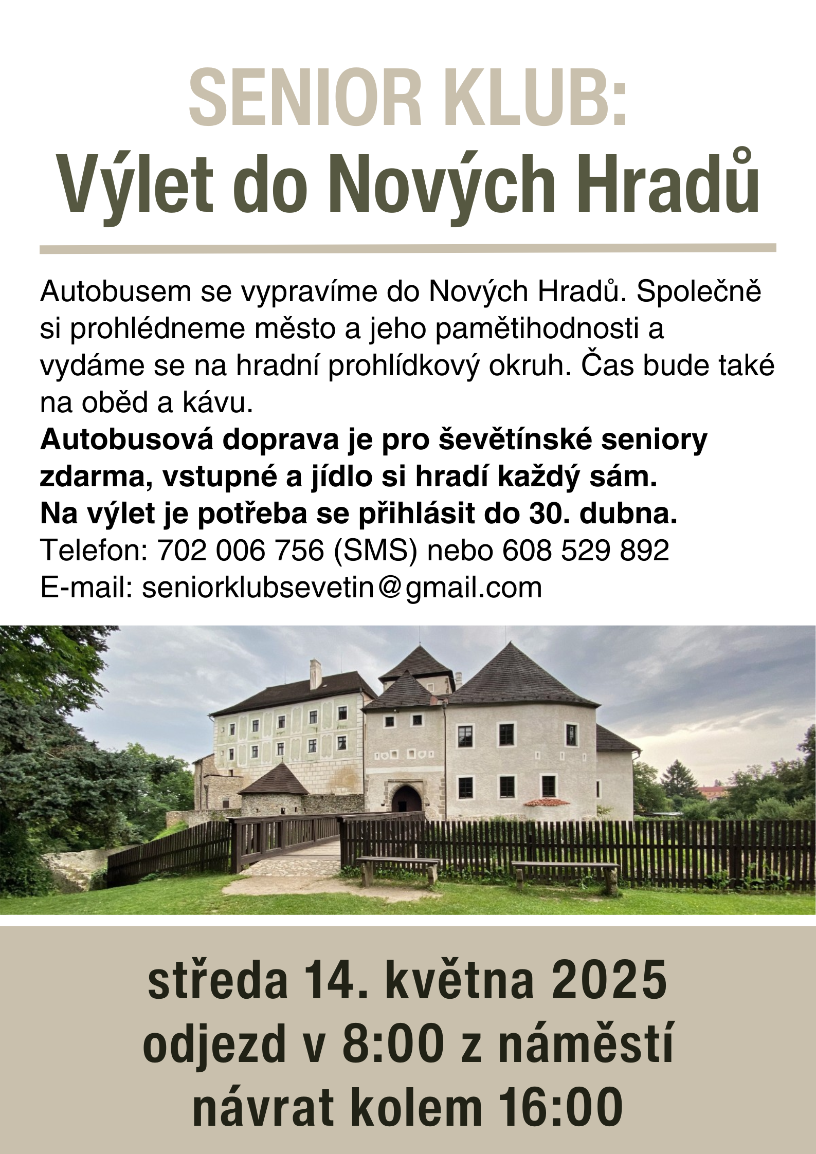Městys Ševětín pořádá zájezd do lázní, odjezd autobusem v 6:00 hodin z náměstí, návrat v cca 20:00 hodin. Cena zájezdu 600,- + 18 eur vstupné do lázní. Obě platby budou vybírané na podatelně úřadu při přihlášení.