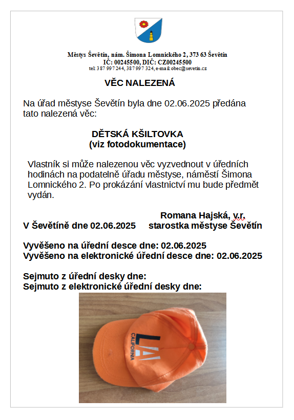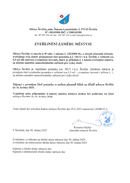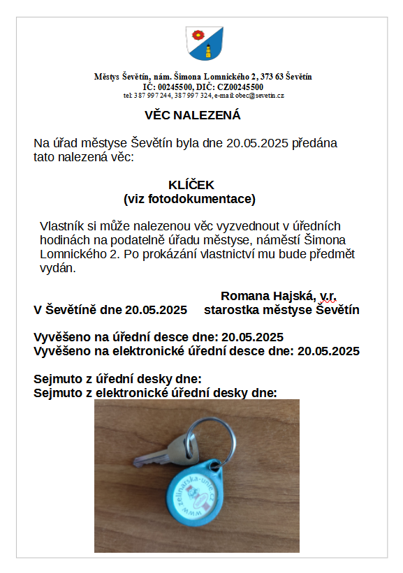 | Vyvěšeno: 30.05.2023 | Bude sejmuto: |