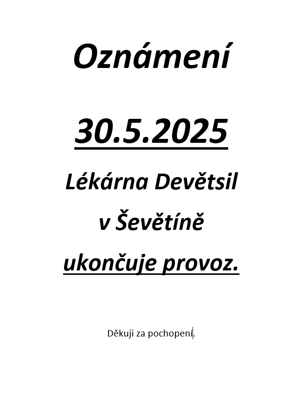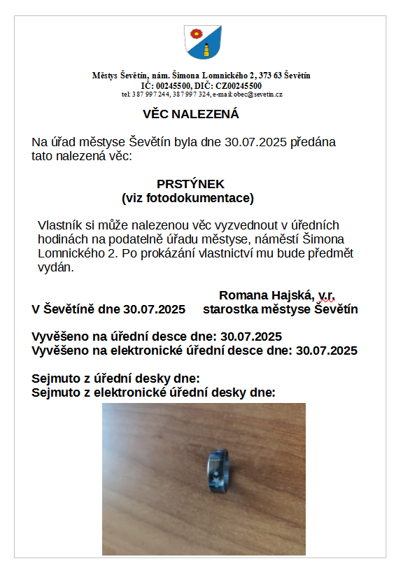 Na úřední desce městyse Ševětín byla zveřejněna informace o vyhlášení volna Základní školy na dny 29.06.2026 a 30.06.2026, viz příloha.