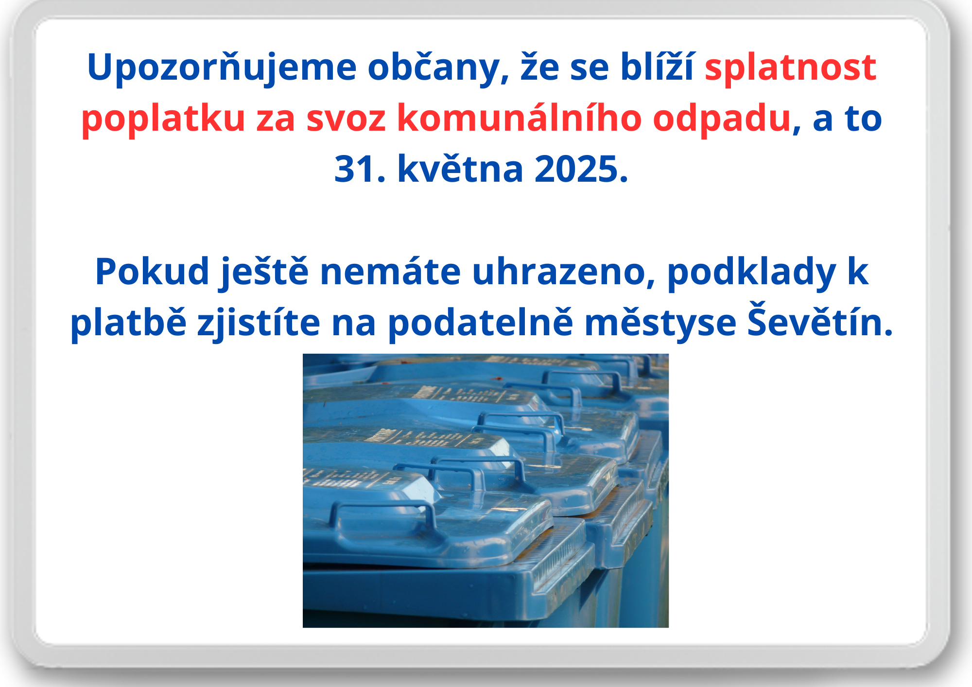 Městys Ševětín zveřejnil stručný výtah z OZV č. 1/2023 (viz Úřední deska-Obecně závazná vyhláška) o přehledu poplatků za směsný komunální odpad v roce 2024, a možnosti jejich úhrady, případně osvobození od poplatků, viz příloha.