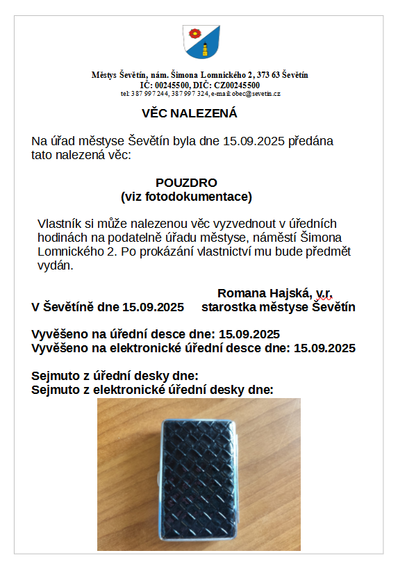 | Vyvěšeno: 08.09.2025 | Bude sejmuto: |