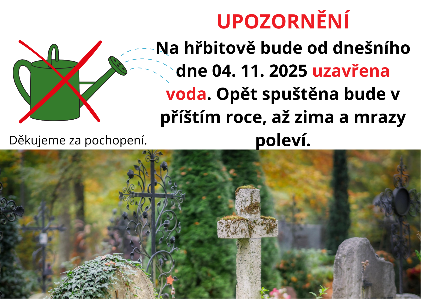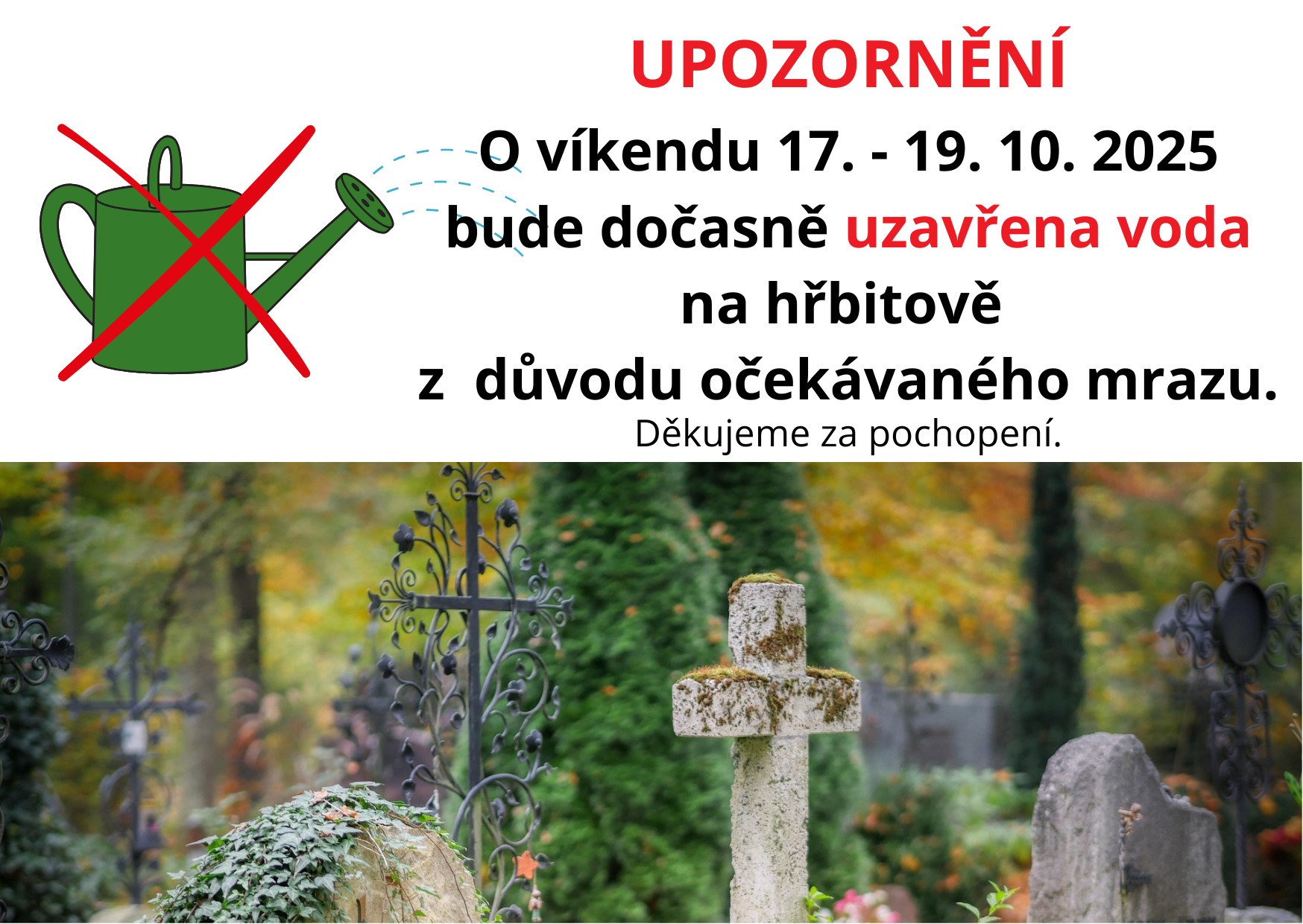 Upozornění - Z důvodu předpovědi očekávaných přízemních mrazů v následujících dnech, bude tento víkend, 17. - 19. 10. 2025 uzavřena voda na hřbitově. Jakmile mrazy pominou, voda bude opět obnovena.