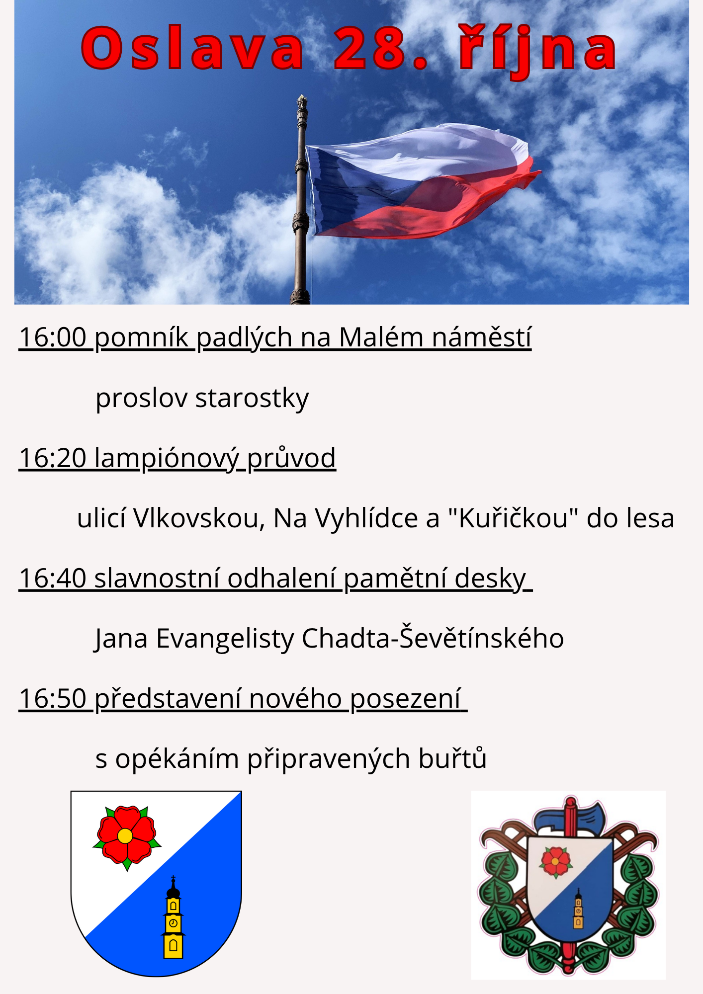Městys Ševětín společně s SDH Ševětín Vás srdečně zvou 28. října 2025 v 16:00 hodin k pomníku padlých na Malém náměstí k oslavě 28. října. Součástí oslavy je lampionový průvod, odhalení pamětní desky Jana Evangelisty Chadta-Ševětínského a opékání bůřtů v novém posezení.