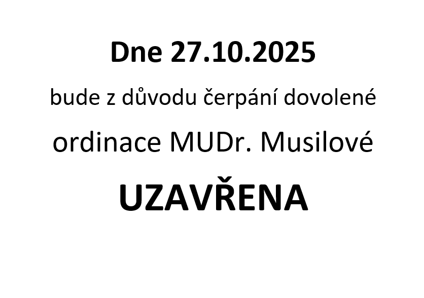 Praktický lékař pro dospělé MUDr. Musilová oznamuje uzavření ordinace z důvodu dovolené, a to v pondělí, dne 27.10.2025. Děkujeme za pochopení.