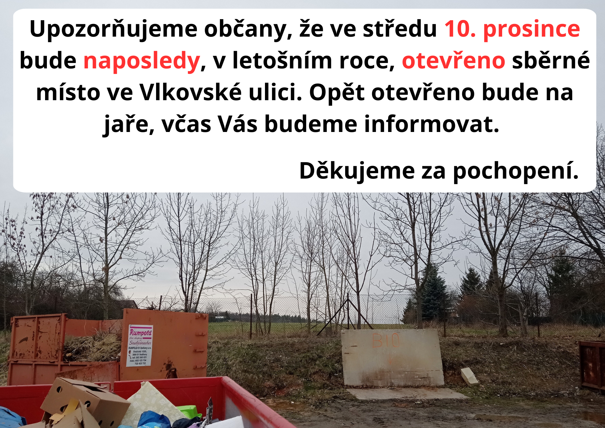 Upozorňujeme občany, že ve středu 10. prosince bude naposledy, v letošním roce, otevřeno sběrné místo ve Vlkovské ulici. Opět otevřeno bude na jaře, včas Vás budeme informovat. Děkujeme za pochopení.