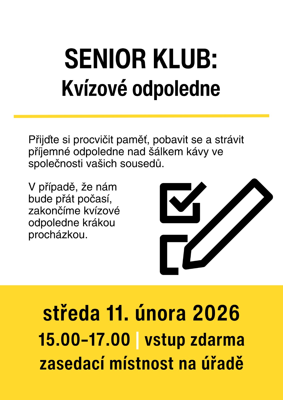 Senior klub Vás zve na Kvízové odpoledne ve středu 11.2.2026 od 15:00 do 17:00 hodin v zasedací místnosti na úřadě městyse. Vstup zdarma.
