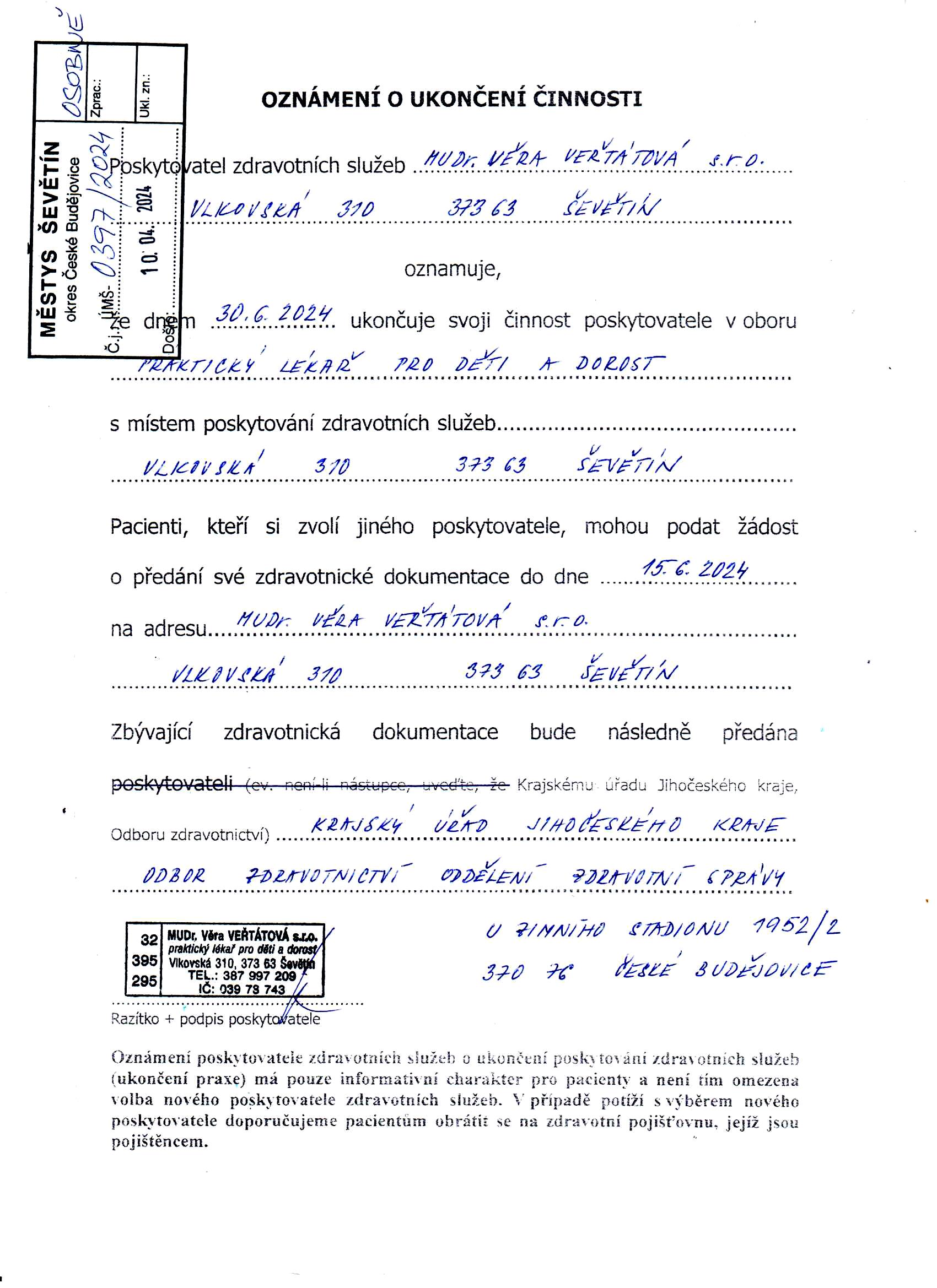 Pacienti, kteří si zvolí jiného poskytovatele, mohou u MUDr. Veřtátové podat žádost o předání své zdravotnické dokumentace do 15. června 2024, zbývající zdravotnická dokumentace bude následně předána na Krajský úřad Jihočeského kraje. V případě potíží s výběrem nového poskytovatele doporučujeme pacientům obrátit se na zdravotní pojišťovnu, jejíž jsou pojištěncem. |