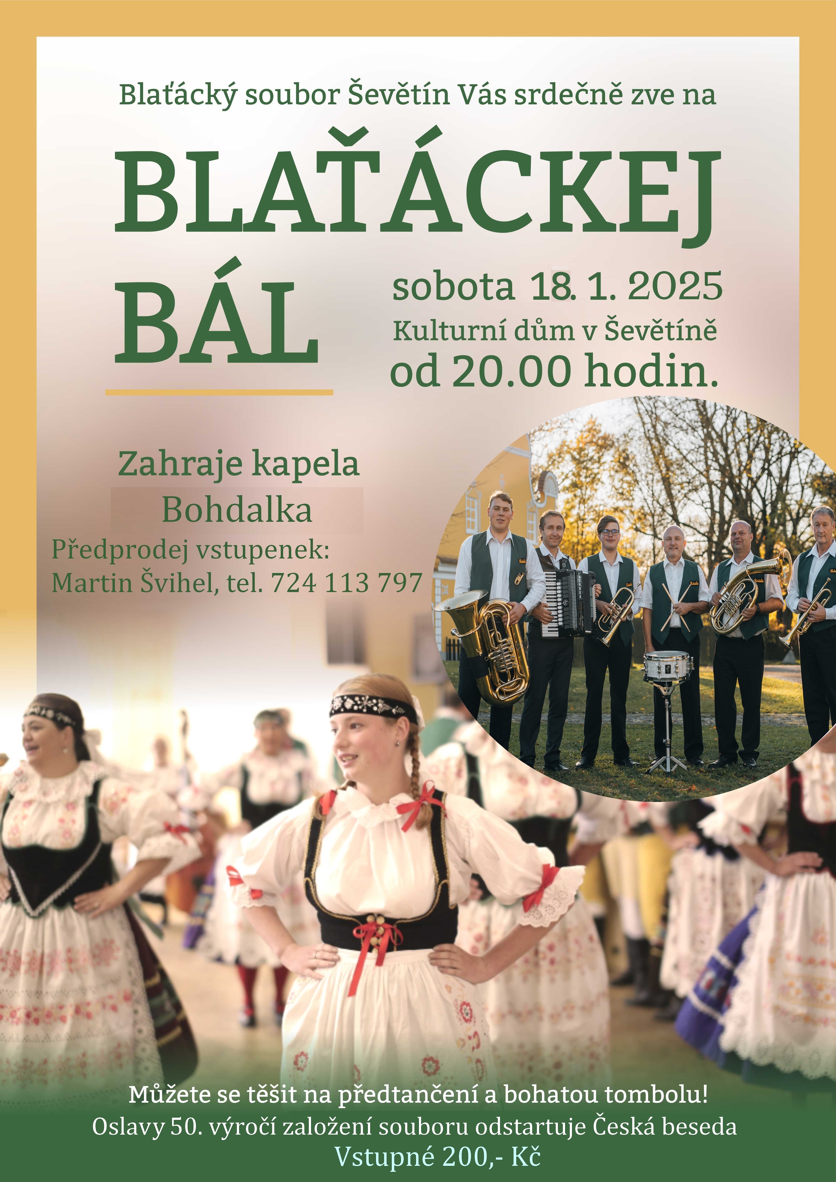 Blaťácký soubor Vás co nejsrdečněji zve do Kulturního domu Ševětín na Blaťáckej bál v sobotu 18. ledna 2025 od 20:00 hodin. Zahraje kapela Bohdalka, předprodej vstupenek Martin Švihel tel. 724 113 797. Můžete se těšit na předtančení a bohatou tombolu. Oslavy 50. výročí založení souboru zahájí Česká beseda. Vstupné 200,-- Kč.