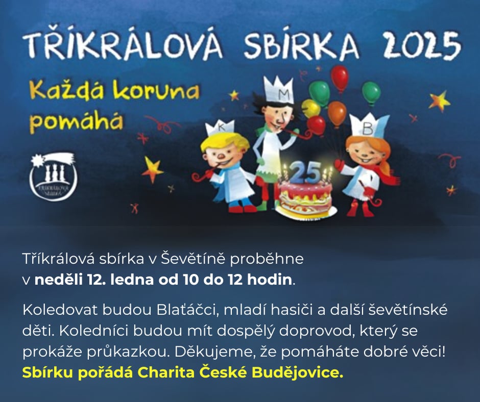 Tříkrálová sbírka v Ševětíně proběhne v neděli 12. ledna od 10:00 do 12:00 hodin. Koledovat budou Blaťáčci, mladí hasiči a další ševětínské děti. Koledníci budou mít dospělý doprovod, který se prokáže průkazkou. Děkujeme, že pomáháte dobré věci. Sbírku pořádá Charita České Budějovice.