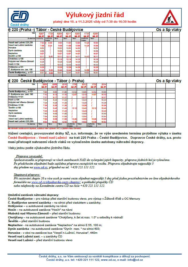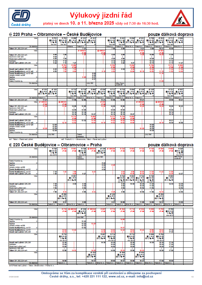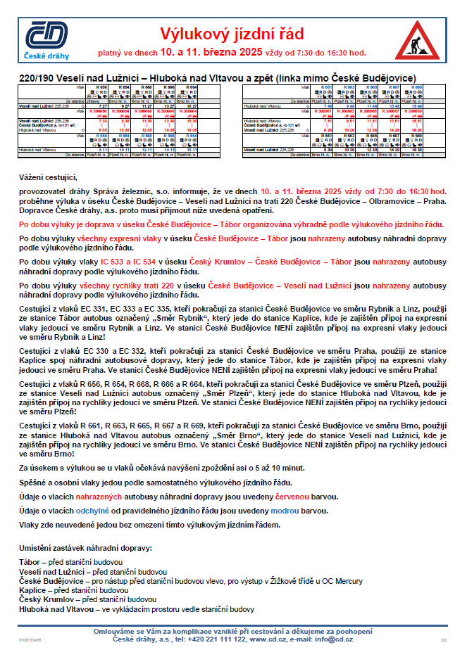 ČESKÉ DRÁHY - VÝLUKOVÝ JÍZDNÍ ŘÁD 10. A 11. 3. 2025