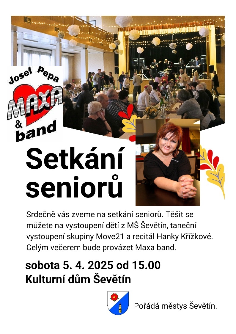 Srdečně vás zveme na setkání seniorů, které se koná v sobotu 5. 4. 2024 od 15:00 hodin v kulturním domě Ševětín. Těšit se můžete na vystoupení dětí z MŠ Ševětín, taneční vystoupení skupiny Move21 a recitál Hanky Křížkové. Celým večerem bude provázet Maxa band.