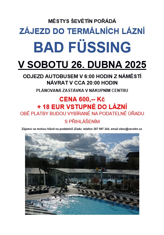 Městys Ševětín pořádá zájezd do lázní, odjezd autobusem v 6:00 hodin z náměstí, návrat v cca 20:00 hodin. Naplánovaná zastávka je v nákupním centru. Cena zájezdu 600,- + 18 eur vstupné do lázní. Obě platby budou nově vybírané na podatelně úřadu při přihlášení.