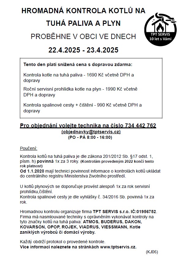 Kontrola proběhne v obci ve dnech 22. 4. - 23. 4. 2025. Pro objednání volejte technika na tel. číslo: 734 442 762. Tento den platí snížená cena s dopravou zdarma: Kontrola kotle na tuhá paliva - 1690,- Kč, roční servisní prohládka kotle na plyn 1990,- Kč, kontrola spalinové cesty + čištění - 990,- Kč. Všechny ceny jsou včetně DPH a dopravy.