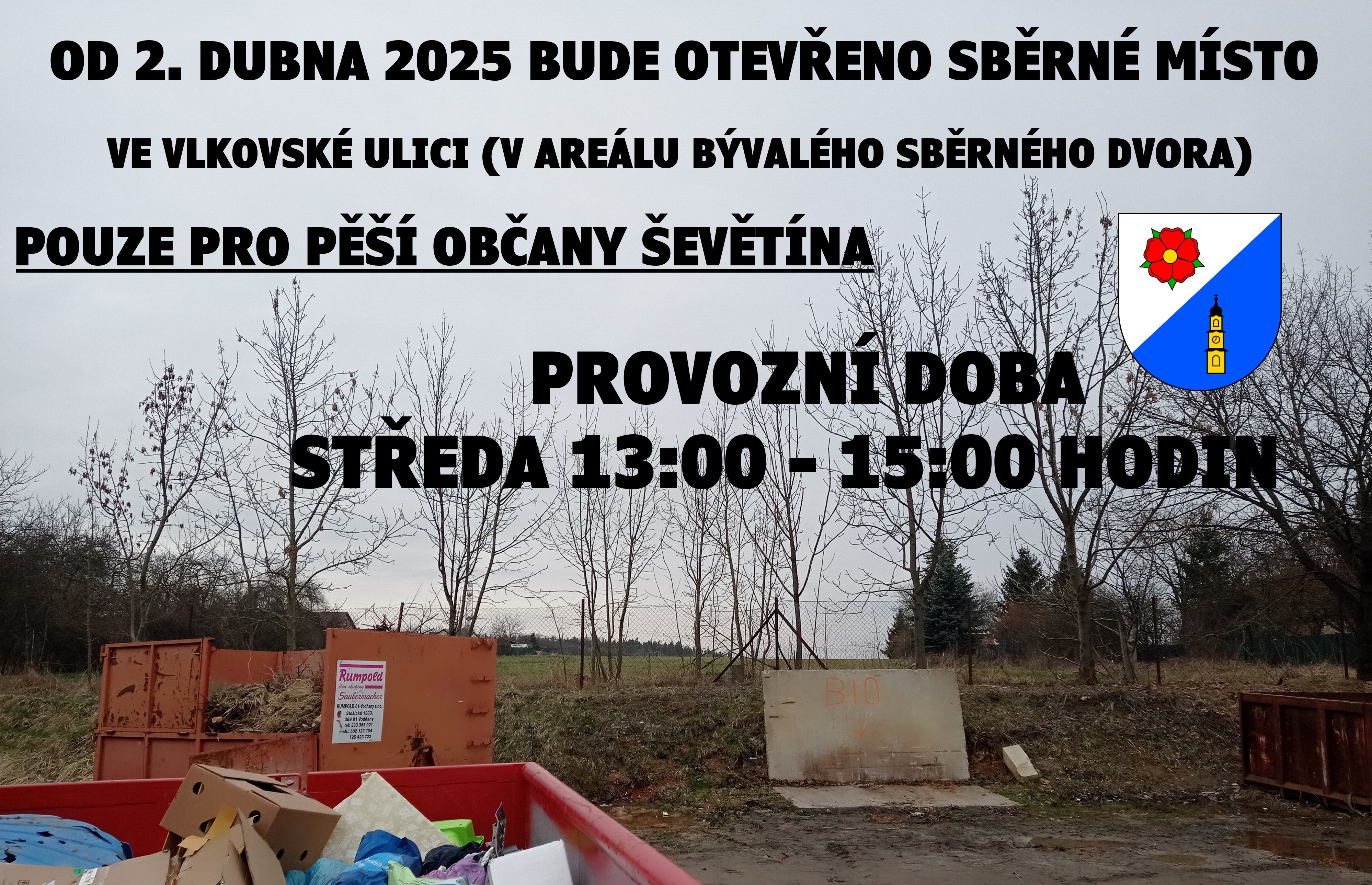 Od 2. dubna 2025 bude otevřeno sběrné místo ve Vlkovské ulici (areál bývalého sběrného dvora), a to pouze pro pěší občany Ševětína. Provozní doba: středa 13:00 - 15:00 hodin.