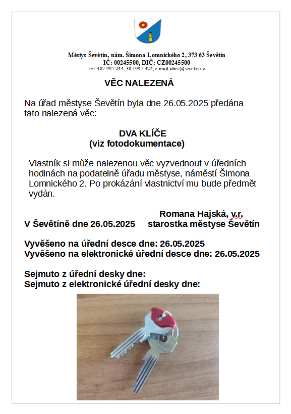 Vlastník si nalezenou věc může, po prokázání vlastnictví, vyzvednout v úředních hodinách na podatelně úřadu městyse.