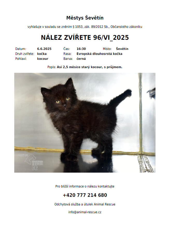 Nález černého kocourka asi 2,5 měsíce starého. Pro bližší informace o nálezu kontaktujte +420 777 214 680.
